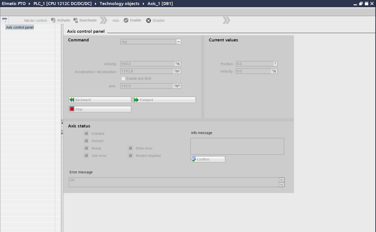 Przed rozpoczęciem pisania programu do sterowania serwem warto sprawdzić czy jest poprawnie skonfigurowane. Mamy dostępne narzędzie Commisioning dostępne w dodanej osi, które pozwoli na wykonanie ruchów testowych (JOG).