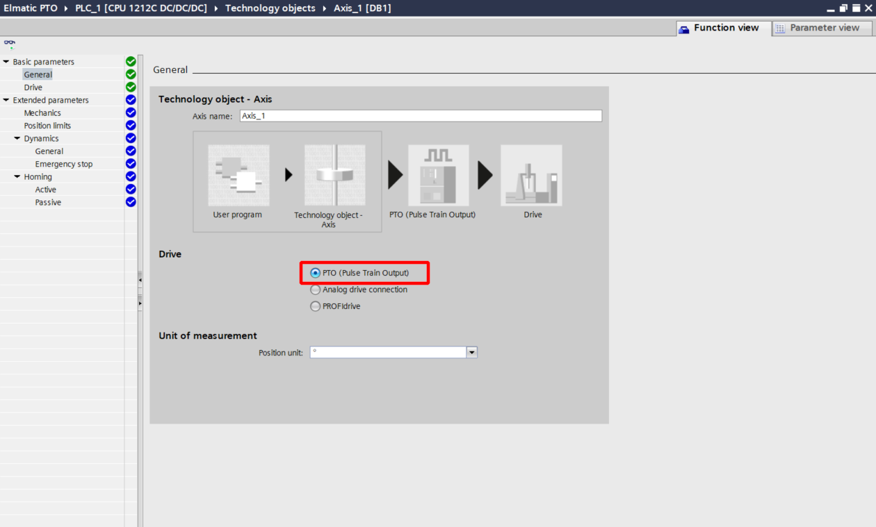 Będziemy sterować sygnałem PTO, jako że nasz ruch będzie obrotowy to w Position Units wybierzmy °.