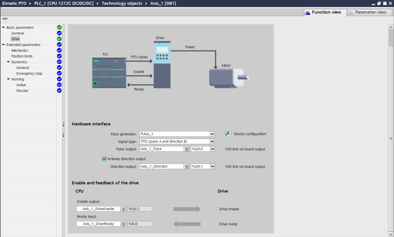 W konfiguracji wejść/wyjść musimy wybrać sygnał krok+kierunek, czyli PTO (pulse A and direction B). Przypisujemy wyjście Q0.0 i Q0.1 pod odpowiednie sygnały. Dodatkowo jak wspominałem w wcześniejszej sekcji będziemy potrzebować sygnału S-ON i warto też dodać sygnał zwrotny S-RDY informujący o gotowości serwa do ruchu. W naszej konfiguracji Q0.2 (Axis_1_DriveEnable) i I0.0 (Axis_1_DriveReady).