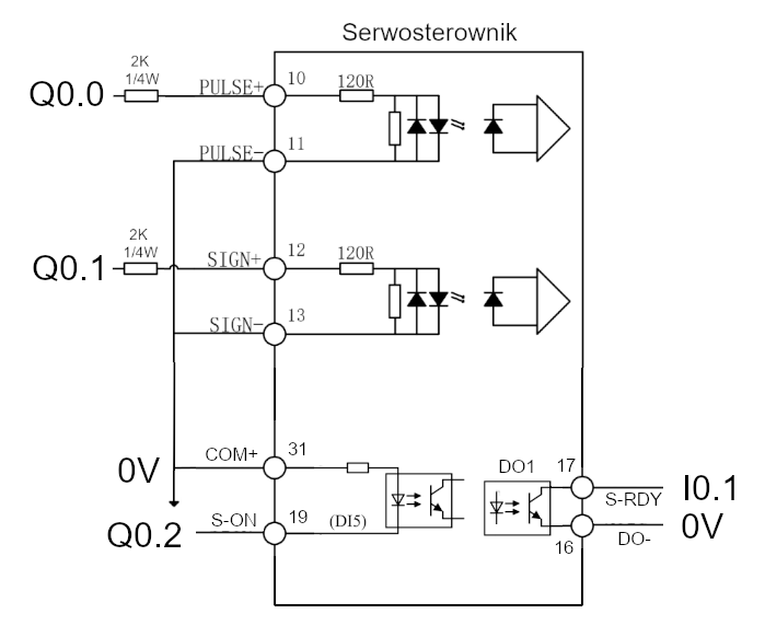 W PLC S7-1200 użyjemy wyjścia Q0.0 do sygnału impulsowego a wyjścia Q0.1 do zmiany kierunku. Dodatkowo ważne jest zastosowanie oporników minimum 2kOhm w celu ograniczenia prądu wchodzącego do optoizolatora serwosterownika, aby zmniejszyć napięcie z 24VDC do 5VDC. Schemat podłączenia PLC <-> serwo wygląda jak poniżej.