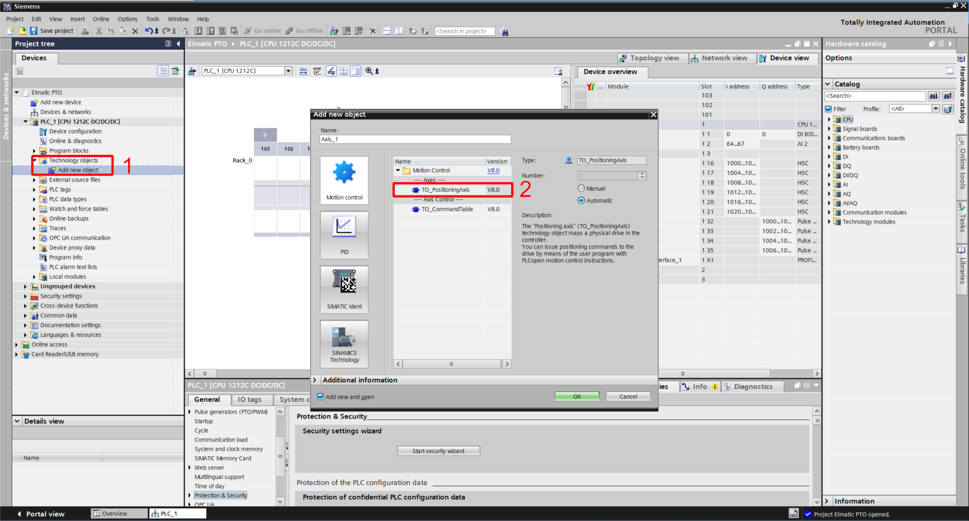 W rozwiązaniu Siemens podobnie jak w innych sterownikach korzystających z funkcji Motion mamy możliwość konfiguracji osi napędowej, dzięki czemu będziemy mogli korzystać z gotowych bloków do sterowania napędem, co znacznie ułatwia proces. W Project Tree dodajemy nowy Technology Obcject. W zakładce Motion Control znajdziemy obiekt TO_PositioningAxis.