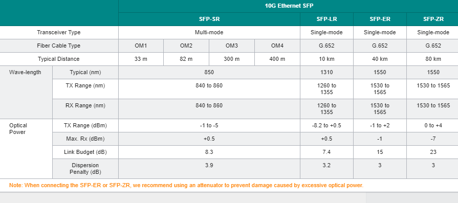 | Optical Fiber | Typical Distance: To reach the typical distance of specified fiber transceiver, please refer to formula: Link budget(dB) > dispersion penalty(dB) + total link loss(dB) |